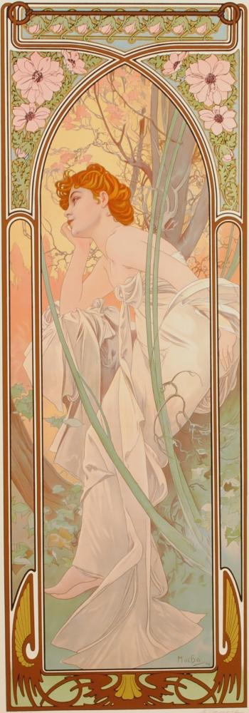 アルフォンス・ミュシャのインテリアの絵画「夕べの夢想」は、オリジナルのリトグラフを元にして制作された複製版画です。